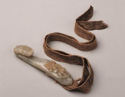 带钩勾头扁宽,为兽头形,肚面浮雕螭纹,螭身呈弯曲爬行状,背部有黄褐色烤色。钩背面为圆形钮,钮柱上附有黄色丝质编织带。