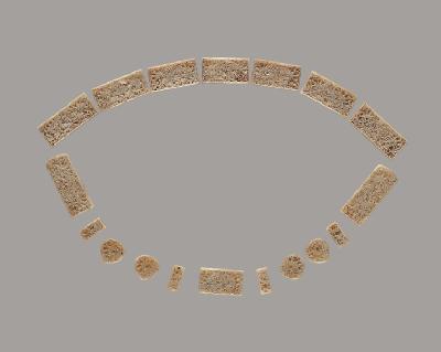 共18块带銙,青白玉,形制各异。透雕镂雕雉鸡牡丹纹,雉鸡嬉戏于牡丹从中,生机盎然。纹饰纤细繁缛,富于变化,工艺精美,表面磨工细腻,抛光润泽。