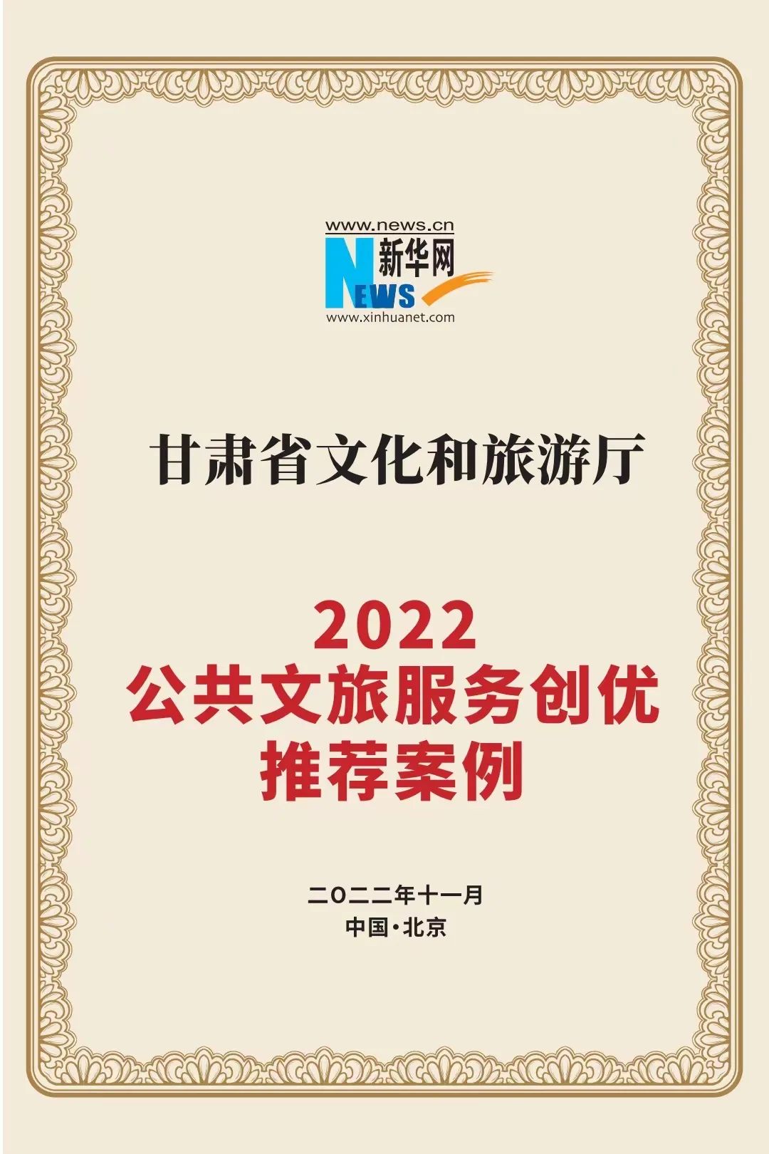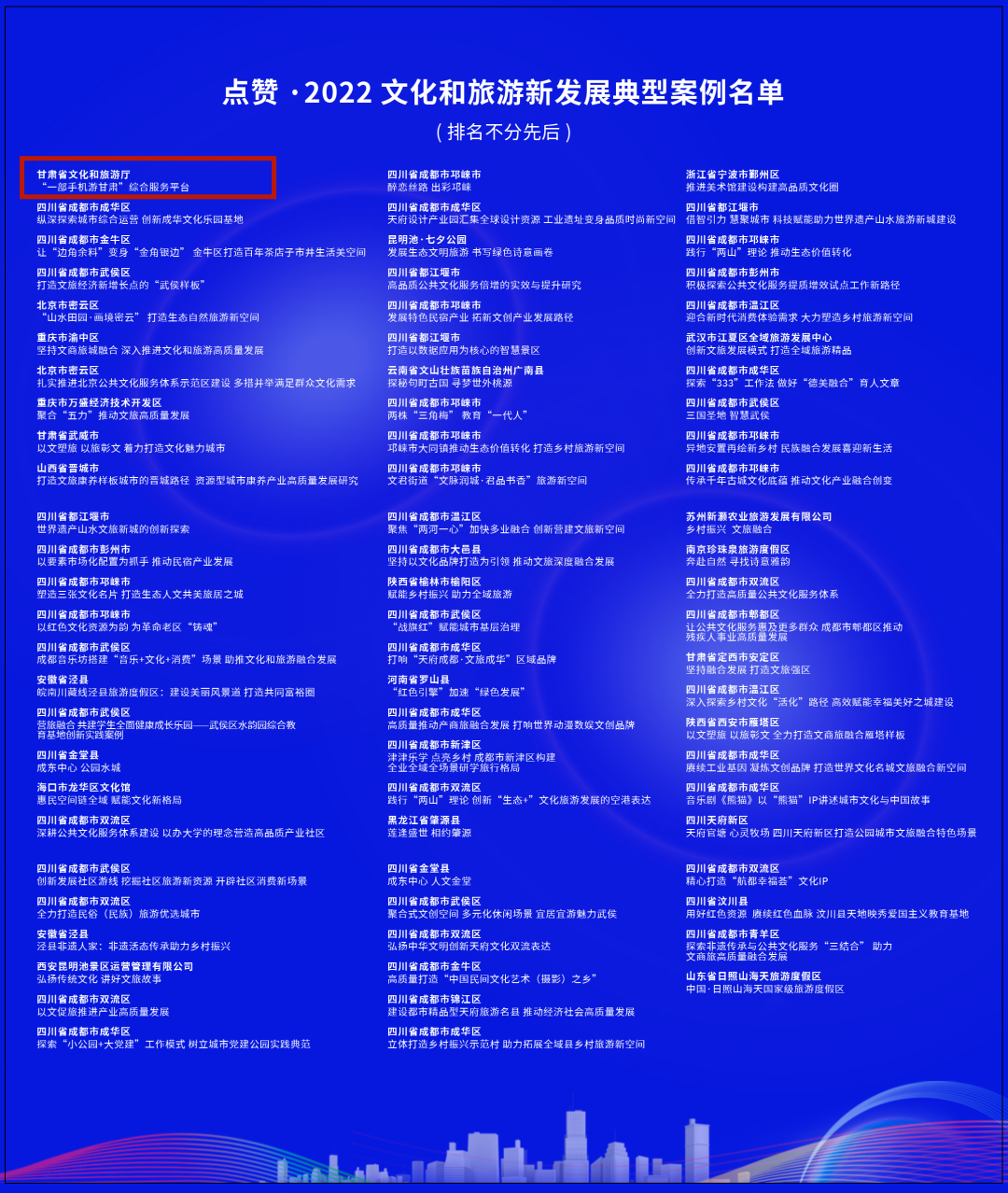 11月5日,由新华网主办的第九届文化和旅游融合创新论坛正式发布了“2022文化和旅游新发展典型案例”名单,甘肃省文化和旅游厅“一部手机游甘肃”综合服务平台入选2022公共文旅服务创优推荐案例。