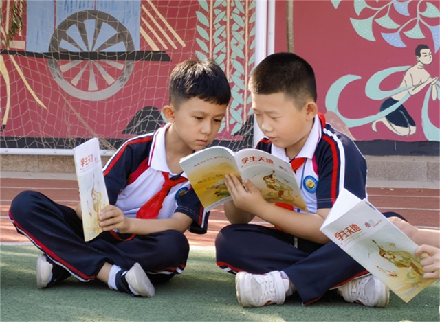 敦煌市南街小学学生在阅读学生天地之《敦煌文化进校园》特刊。敦煌市委宣传部供图