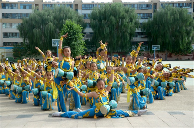敦煌市南街小学学生排练舞蹈《鼓乐敦煌》。敦煌市委宣传部供图