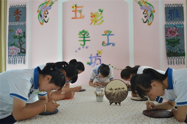 敦煌市黄渠中学学生学习木板雕刻画。敦煌市委宣传部供图