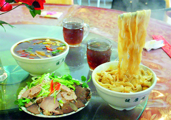 随着时代的变迁,凉州老茯茶这一寻常百姓家的汤水,却和腊肉、行面为伍被冠以“三套车”的名字,并作为名优特色小吃,堂而皇之地摆上了大庭广众市场的桌子,成了百姓胞腹、念旧、回味的佳肴,就是这壶普通的老茯茶,以经济学的说法,它一头连着市场,一头连着消费者,完美地与其他小吃营造出了人人都喜爱的精神大餐。每当食客在熙熙攘攘的市场吃着腊肉,挑着行面,品着老茯茶,耳听着叫卖声,眼观着面皮、凉面、肉夹子等各色小吃,那一定是精神和物质的大会餐,也是眼耳鼻舌身意的大满足。