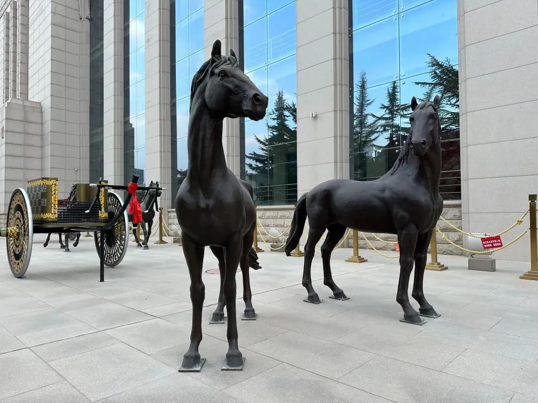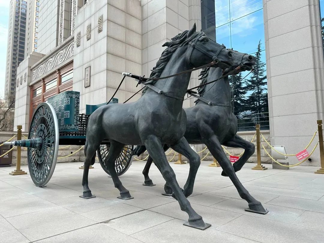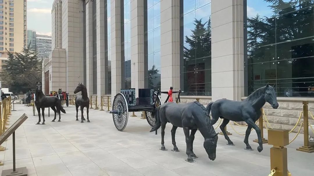 为了让文物“活”起来,甘肃省文旅厅委托制作方在原有的四辆马车基础上创造性增加四组共八匹铜马,并用祥和、交流、蓄势、奔腾四种寓意阐释八匹铜马,象征着今天甘肃深度融入“一带一路”建设,踔厉奋发、笃行不怠,奔赴富民强省新征程的斗志和作为。