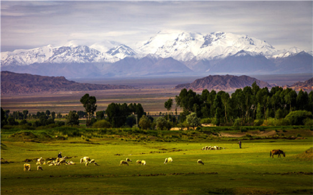 昌马四面被大山环绕,近处的群山丹霞似火,远处的青黛色山峦苍苍茫茫,耸立的雪峰在山间闪耀着圣洁而神圣的光芒。远处的天空雨雾相接,天地迷离,可是眼前的天空却云朵翻滚,山上飘移着一朵又一朵白云虚幻的身影,一大朵一大朵的云像是满天空怒放着的白色牡丹,地垄上的树像被园艺师精心修剪过,每一棵都像一把圆圆的伞。昌马的海拔高,气温要低一些,出产的牛羊肉味道鲜美独特。七月的田野里,麦苗儿才刚刚抽了穗,除了种植小麦胡麻,这里又引种了藜麦,秋天成熟之后藜麦或黄或红,为秋天的昌马再调一道浓郁的色彩。
