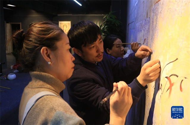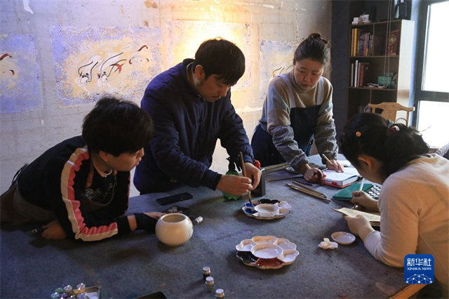 2月22日,在敦煌小镇鸣沙书院,艺术工作者张杰龙(中)指导学员临摹敦煌壁画。新华社发(张晓亮摄)