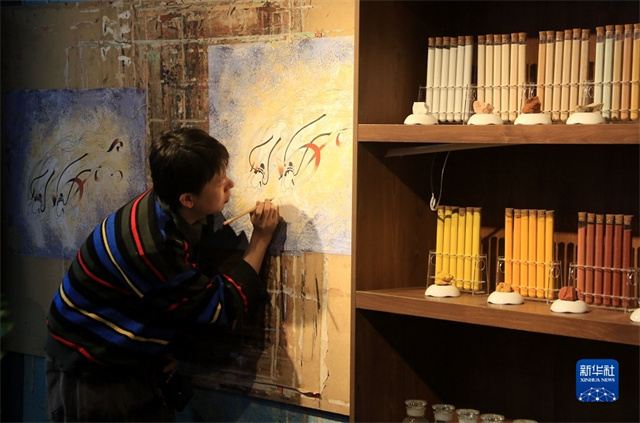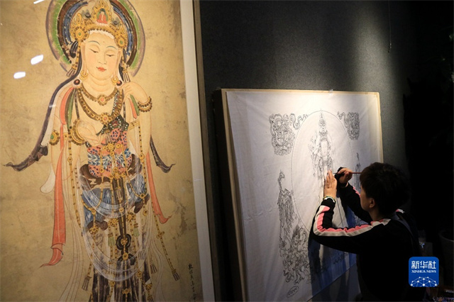 2月22日,在敦煌小镇鸣沙书院,来自陕西的学员吴恩梵学习敦煌壁画临摹技艺。新华社发(张晓亮摄)