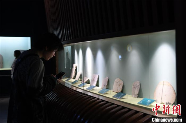 图为游客在参观古生代、中生代、新生代岩层发现的古生物化石。