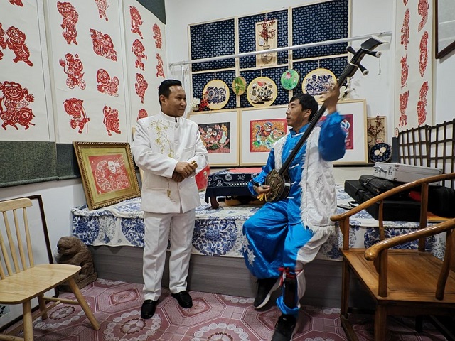 48岁的南梁说唱市级传承人刘小平说,自从有了非遗工坊,原本散落各地的传承人便有了一个相聚、学习、交流的平台。几乎每晚七点到九点,他们都聚在这里,一起琢磨新唱词、演出新曲目,有时还会在短视频平台直播表演。