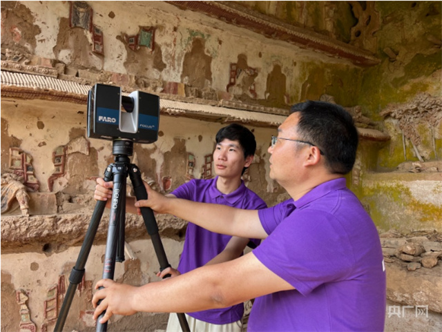 在红崖寺石窟,南开大学工作人员运用三维激光扫描仪、无人机等设备,根据洞窟实际,进行全面到位的拍摄扫描,以数字化的方式记录文物,留存真实的现场图景。