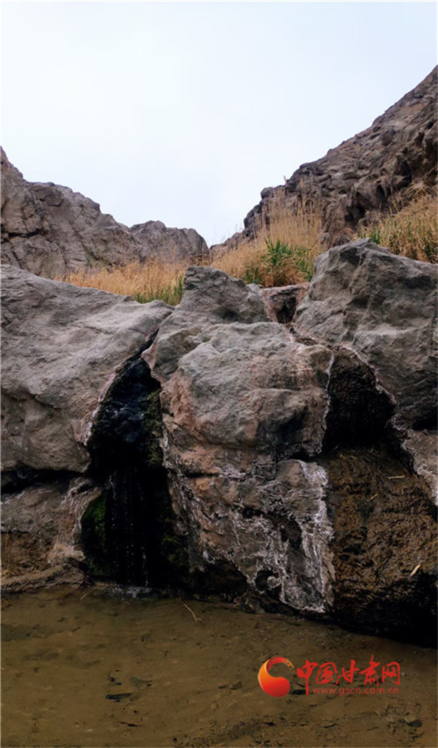 顺着悬泉置遗址向峡谷前行,小路的尽头有一片绿洲,芦苇丛生,郁郁葱葱,在芦苇于巨石之间山泉流淌源源不断,由于山泉水从不是从地下渗出,而是从悬空流出,所有才有悬泉之名。也正是悬泉滋养,为四周处于戈壁之中的悬泉置提供了稳定水源,让这里成为丝绸之路上的重要驿置。