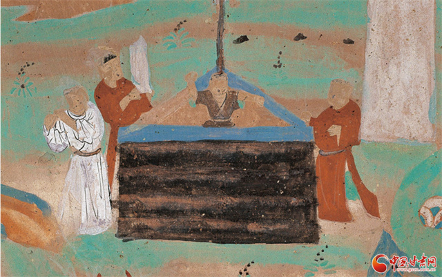 在宋代第55窟东壁门南侧的金光明经变右侧,有一幅壁画,从上到下,将一个“流水长者子救鱼”故事娓娓道来。