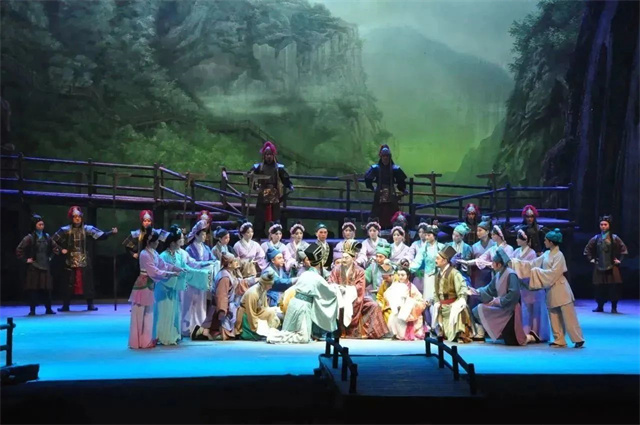 大型民族陇剧《官鹅情歌》由第16届“梅花奖”获得者雷通霞和第21届“梅花奖”获得者边肖领衔主演。该剧由著名剧作家曹锐担任编剧,讲述的是甘肃陇南地区官鹅沟的一段凄美爱情故事。因为表现的是少数民族的生活场景,剧目在创排时,严格遵照戏曲艺术规律进行创作,在尊重传统戏曲的表演范式的基础上,增加了一定篇幅的极富民族风韵的舞蹈来烘托舞台氛围,既能表现出西北草原上少数民族男子汉的粗犷豪放,又能凸显少数民族女性的温婉与飒爽,加上陇剧民族音乐的衬托和陇剧独有的嘛簧帮腔,更能在剧情推进、人物命运转折、音乐色彩丰富程度上推波助澜,收获了良好的效果。