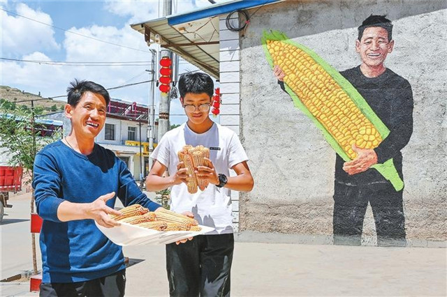 会宁县青江驿村刘猛(左)的丰收图景上墙。