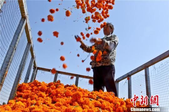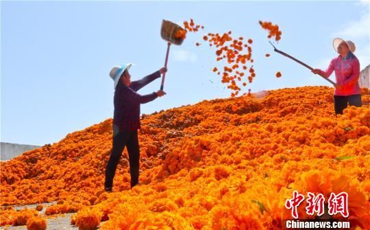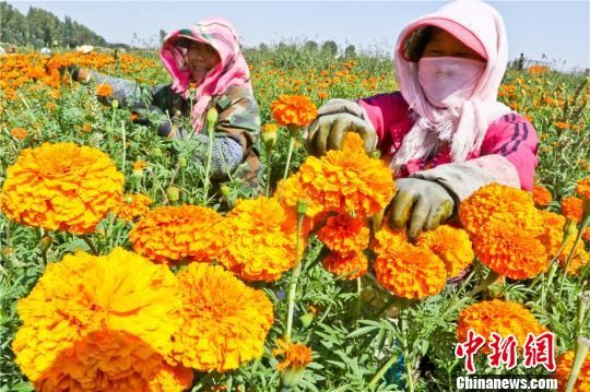 8月15日,初秋时节,甘肃省临泽县种植的1万多亩万寿菊花陆续盛开,村民们正忙着采摘收获。万寿菊既具有观赏性也具有较高经济效益,从花中提取的天然黄色素被广泛用于食品、医药、化工等领域。今年临泽采用“公司+专业合作社+种植大户”的发展模式,种植万寿菊1万多亩,年加工转化3万吨,预计可收入2500万元,农户每亩纯收益超过3000元,万寿菊盛开形成金色花海不但为发展乡村旅游和观赏农业带来了契机,也成为农户增收的新途径。
