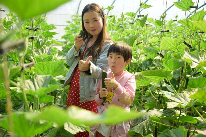 游客正在静宁县界石铺镇李堡村蔬菜采摘园体验采摘西红柿、黄瓜等蔬菜,大家吃着新鲜的黄瓜赞不绝口,伸出了大拇指点赞。