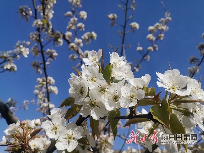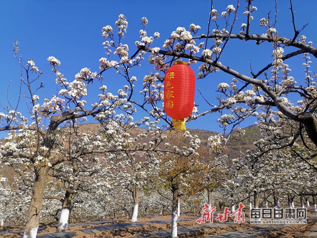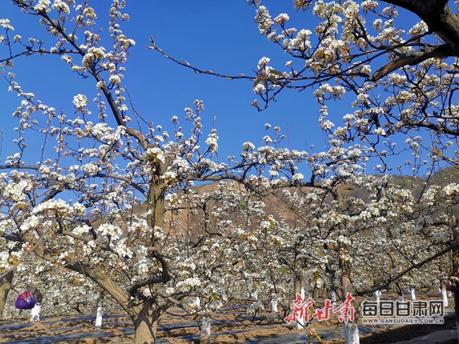 走进静宁县界石铺镇,放眼望去,径直见白玉般的花朵竞相绽放,花缀满树,成片柔白似雪,在柔暖的春风里颇为壮观。梨园内,往来游人络绎不绝,游客们穿梭在淡雅洁白的梨园花海中,或拍照、拍视频留下美好瞬间;或三五成群嬉戏打闹,笑声爽朗……体验着如诗如画的乡村风光。
