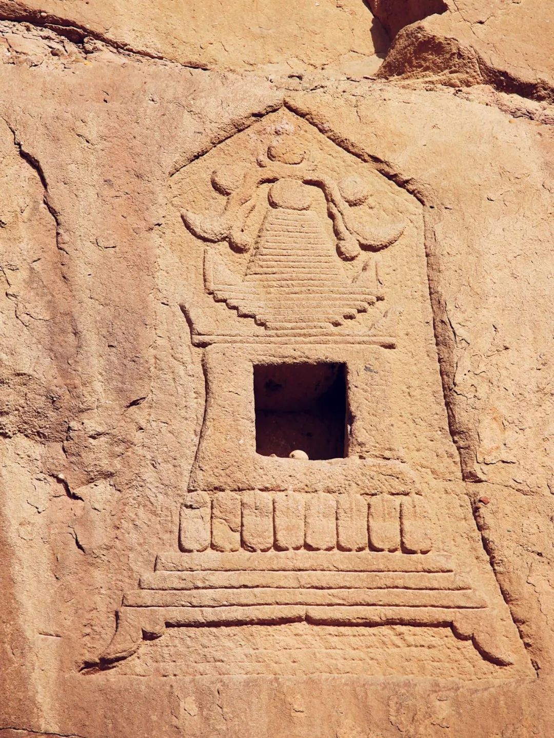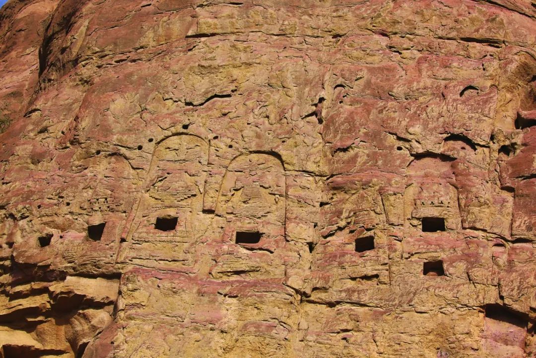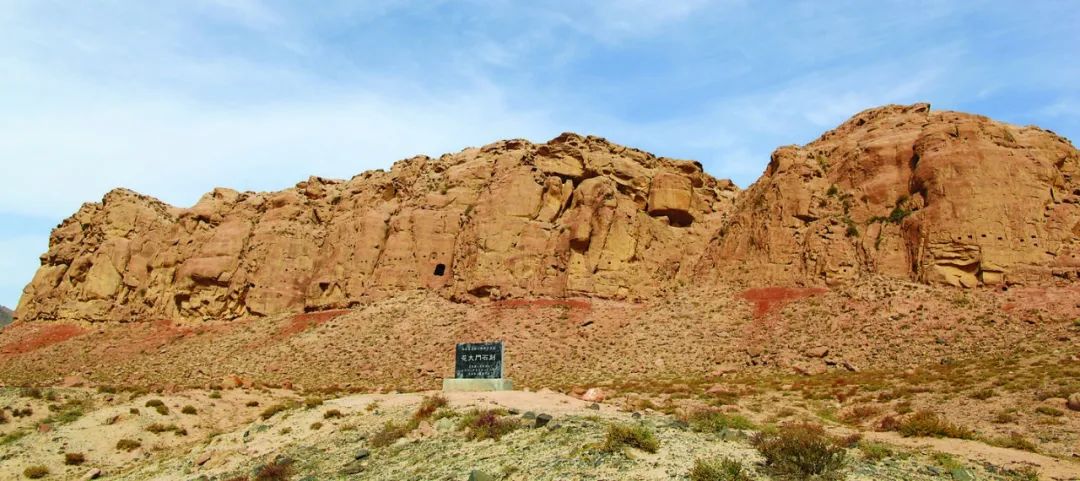 御山峡入口,相传正是北丝绸之路途经永昌至新疆的咽喉要道,两边为山体,中间有一座独立的,形如睡佛的陡峭崖壁,是被誉为“珍珠林海”——花草滩的入口,又像是打开的一扇大门,故而得名“花大门”。这座悬崖峭壁上留下了西夏至明朝时期形状大小不同的石窟石刻50余处,相传是西夏名僧高僧的一种“葬式”——塔龛悬葬,每个石窟外套刻一尊佛塔,石窟里刻有西夏文字和岩画,形成了“阁中有塔,塔中有画”的西夏建筑文化特征。