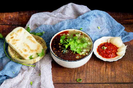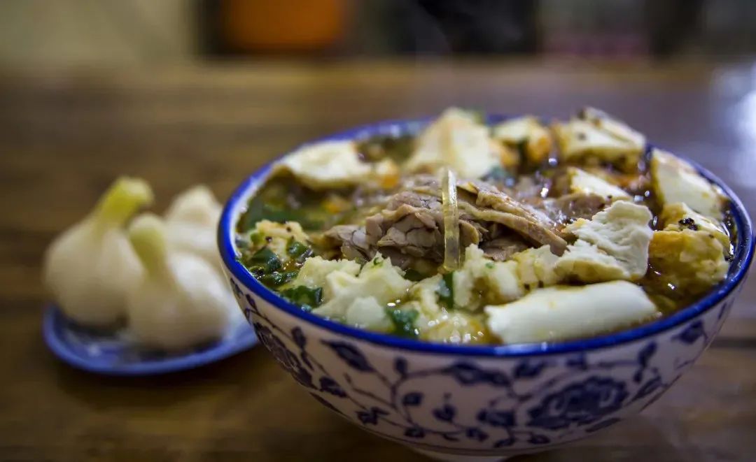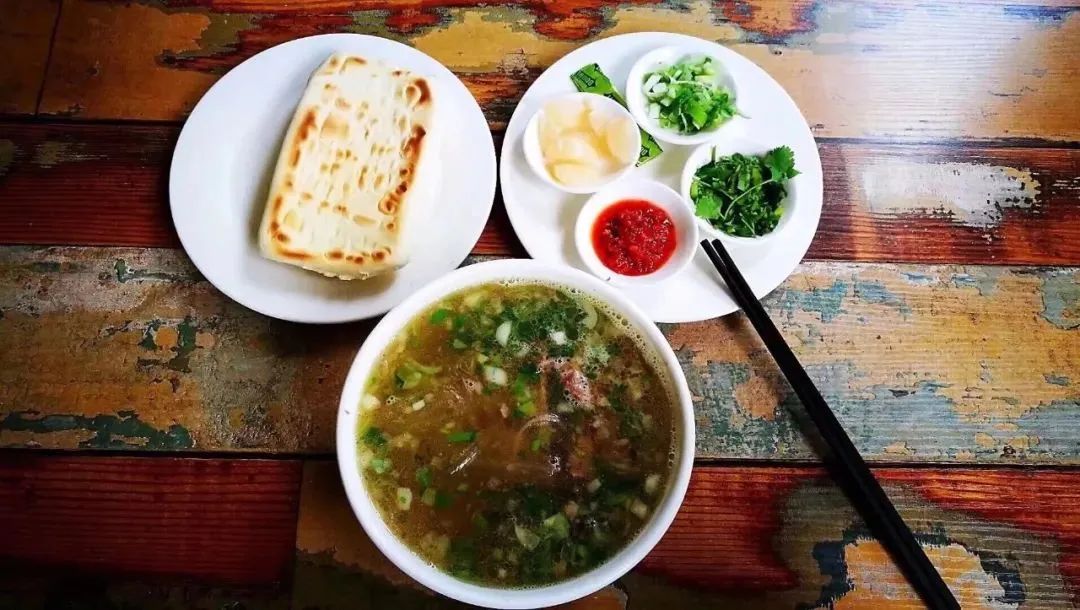 这碗羊肉泡里无一不透着平凉人的性格因子,纯朴粗犷、实实在在。一碗量大粉多的羊肉汤、一块烙馍、一勺辣椒、三两糖蒜。热腾腾地开胃,吃下去是从头到脚的舒坦,红光满面,精神气十足。