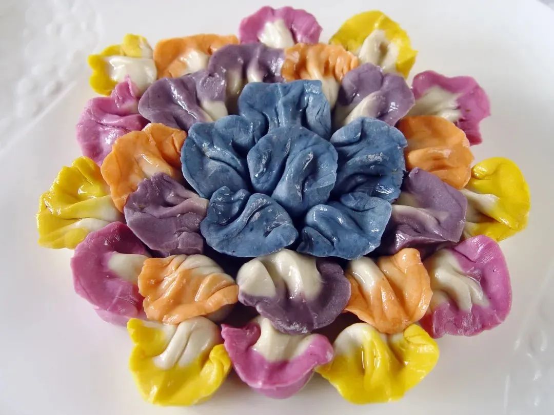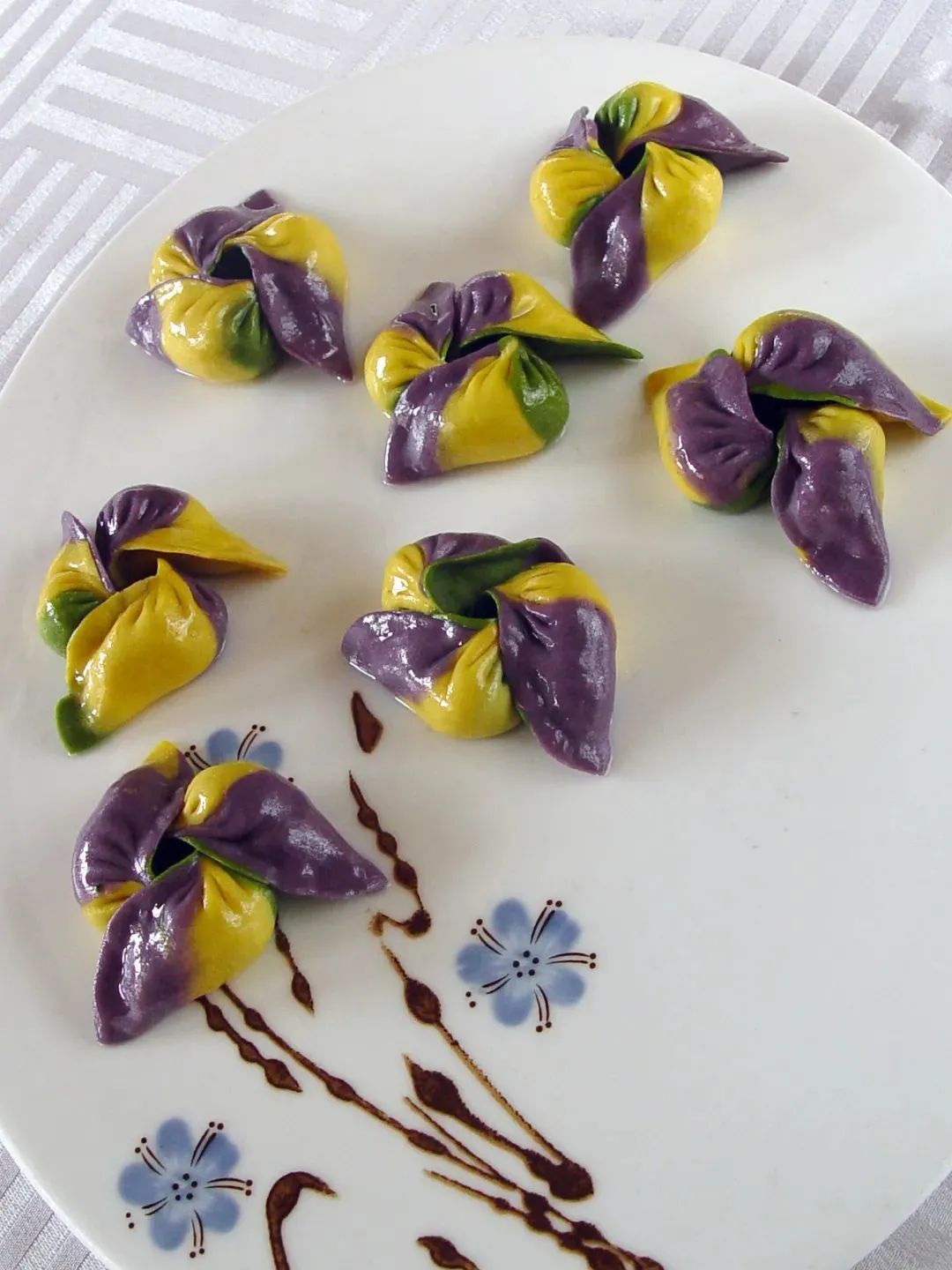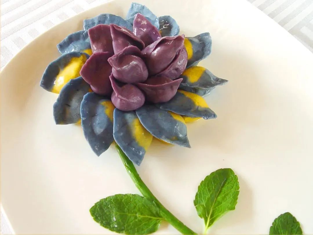 七彩饺子造型栩栩如生、美妙绝伦、生动别致,融合了西部花城的特点。饺子的颜色赤、橙、黄、绿、粉、蓝、紫、灰,均从天然花卉、水果及蔬菜中纯手工提取,具有抗氧化、增强免疫力、延缓衰老、益气补血、养肝明目的保健功效。