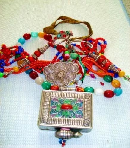 同时,妇女们在脖颈上还要戴数串琥珀、玛瑙、翡翠、玉、蚌等组合搭配的项链。在无名指、中指上戴银质、玉质戒指,手腕上戴象骨、琥珀、玉石、玛瑙质手镯。蒙古族妇女佩戴的饰物,除了头饰、耳环、项链、手镯、戒指以外,还有种佩挂在袍子右上襟扣子上的饰物,叫“布特格”。这种饰物,小巧玲珑,精致华美。