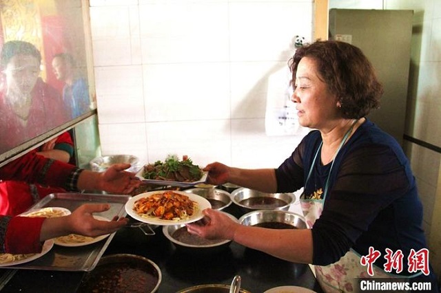 资料图为甘肃敦煌一面馆的服务人员为顾客端上驴肉和黄面。中新社发 敦煌市委宣传部供图
