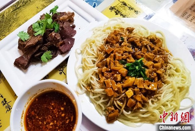 资料图为驴肉黄面。中新社记者 冯志军 摄