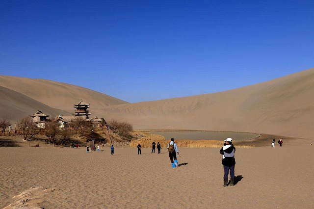 游客在敦煌鸣沙山月牙泉景区游览