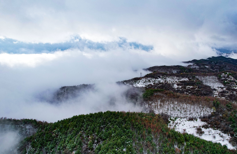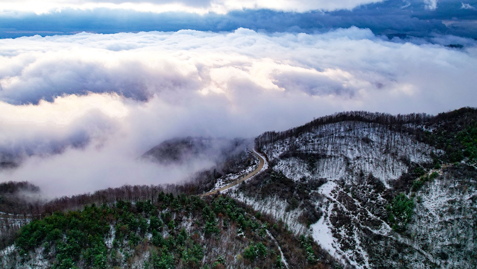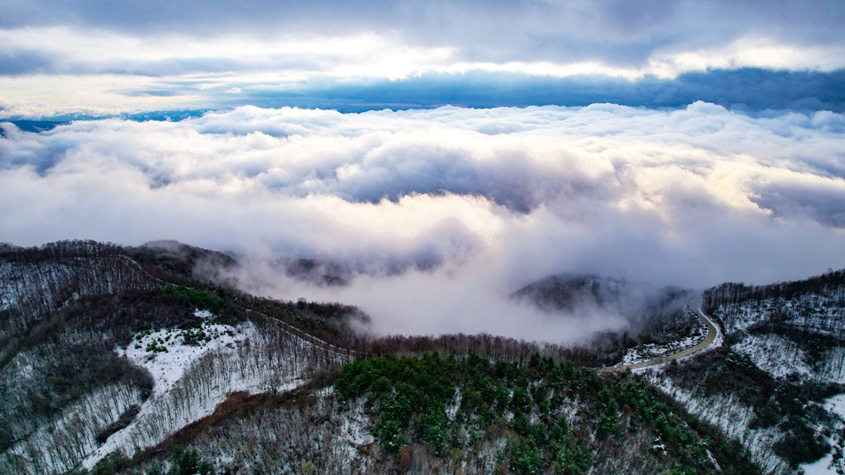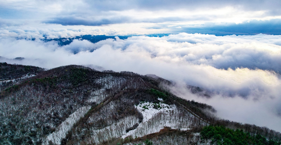 春雪和云海相遇,现雪中云海景观,景象蔚为壮观。