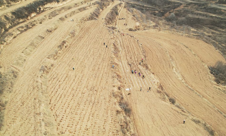 永清镇马沟村西灵山金银花种植基地,村民们抢抓农时,正在地里栽植金银花。起坑、放苗、培土,村民们分工明确,动作熟练,栽植的金银花苗整齐排列,田间地头一片繁忙景象。