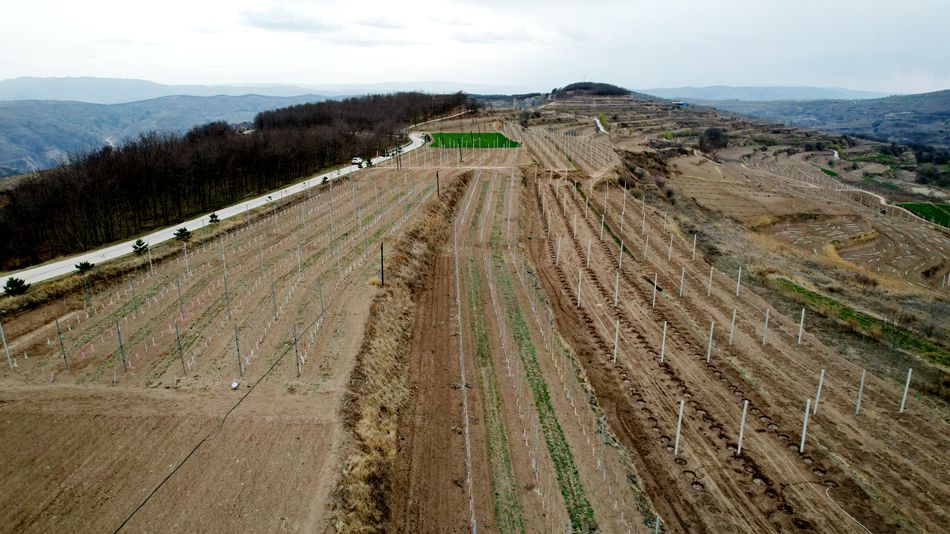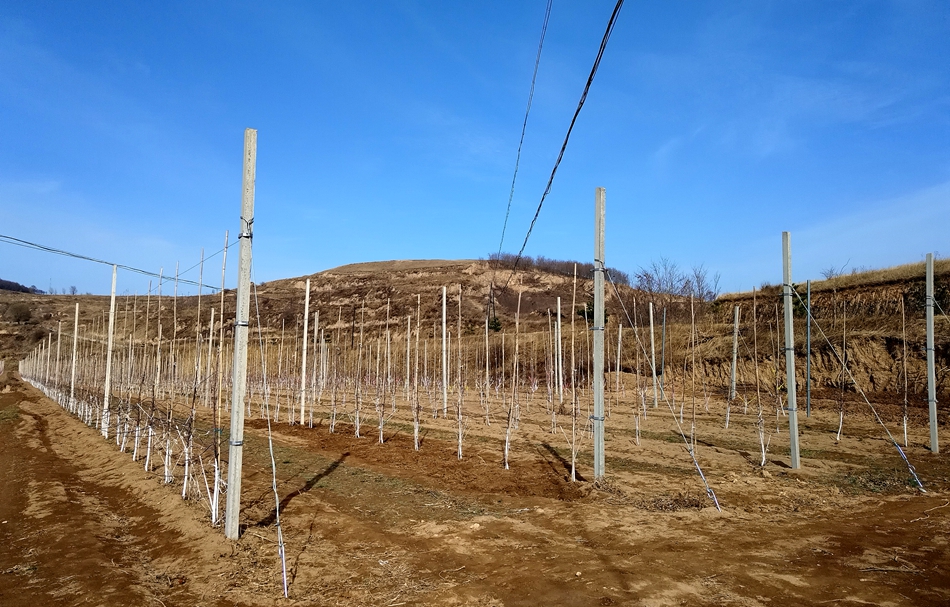 果农们正在建设的这个果园与传统果园不同,果园内整齐竖立的水泥柱准确地区分出行、行列,新栽的果树每行的间距只有1.3米,远远小于乔化果园的间距,每亩地要栽植125棵树,也远远高于乔化果园每亩的45棵树,这就是近年来清水县正在推行的矮砧密植模式。