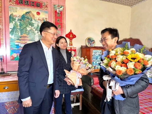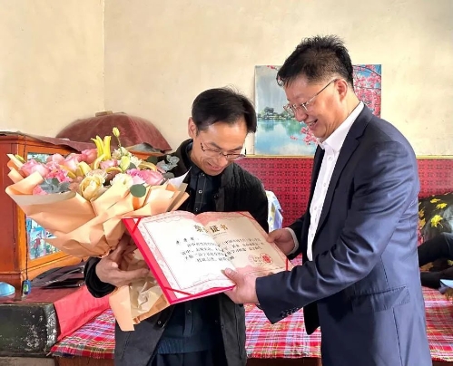 何鹏峰、王蕾带着春节的美好祝福和全县人民的深情厚谊,来到红寺镇魏沟村50岁农民工朱彦军家中,向他送去党和政府的关爱与祝福。在送上鲜花和慰问金的同时,为他颁发了“静宁县优秀传统文化学习模范”荣誉证书。