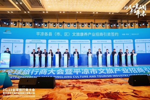 4月13日,2023年全球旅行商大会开幕式后,平凉市举行文旅产业招商引资推介会,签约项目14个,总投资42亿元。其中静宁县签约项目2个,总投资8.15亿元。