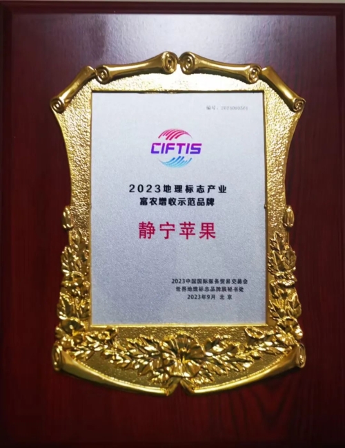 在2023中国国际服务贸易交易会(以下简称“服贸会”)暨世界地理标志品牌分销服务大会上,“静宁苹果”荣获“富农增收示范品牌”荣誉称号,静宁县苹果产销协会填报的《地标富农促转型、苹果产业换新颜》案例荣获“富农增收示范案例”荣誉称号。