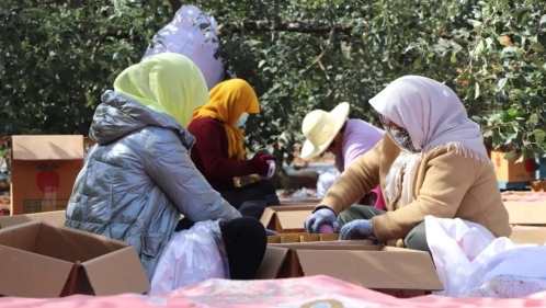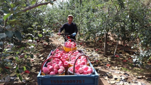 果园里,果农们将新鲜的苹果采摘下来,分拣工、包装工和装卸工们各司其职,分拣、装箱、称重、装车井井有条,一箱箱苹果将被客商售往各地。