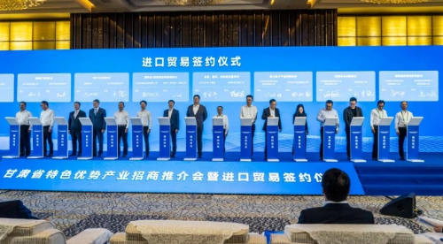 在甘肃省特色优势产业招商推介会暨进口贸易签约仪式上,甘肃德美地缘现代农业集团有限公司、静宁中天商贸有限公司、静宁县阿阳产业投资集团有限公司分别与比利时NEW BRORDER BOVEBA、西班牙VINÍCOLA DE CASTILLAS.A.维尼古拉酒庄、香港特别行政区中华物流港中华贸农产品签订了采购项目合同,成交金额1862.96万元。
