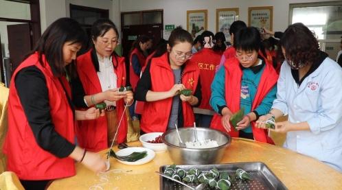 志愿者们来到新盛社区和福利院为老人们送去了慰问。活动现场气氛热烈,糯米、粽叶、馅料等材料被摆了一大桌,大家说说笑笑围站在一起,分发粽叶,麻利地转成漏斗状,舀糯米,放蜜枣,捆粽子。转眼间,一个个棱角分明、青翠欲滴的粽子呈现在大家面前。“亲手包的粽子好吃”活动现场欢声笑语、其乐融融。还有缝制香包,每个人都分发到香包、艾叶、流苏以及针线等材料,大家唠着家常,说着心里话,一双双灵巧的手把自己对生活的热爱全都包进了鼓鼓地荷包里,浓浓的节日气氛拉近了彼此的心。