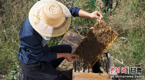 近日,走进平凉市静宁县界石铺镇甜蜜驿站的养蜂基地,一个个蜂箱错落有致地遍布其中,一群群蜜蜂飞进飞出,“嗡嗡”声不绝于耳。管护人员张鹏磊正小心地揭开蜂箱,察看蜂群产子、采蜜等情况。