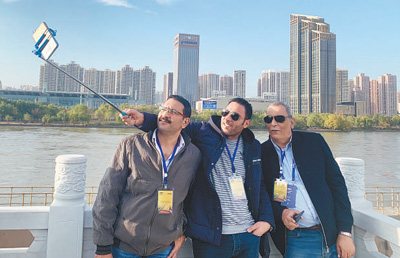夕阳西下,黄河流水湍湍,两岸一片苍翠,间或点缀着一缕秋叶黄,高楼映衬着蓝天悠悠。“真漂亮,来,拍照!”来到由兰铁泵站改造而成的观景亭,第二期“一带一路”新闻合作联盟短期访学班的15名阿拉伯国家媒体记者对眼前奔涌不息的黄河赞叹不已,纷纷拿出手机合影留念。