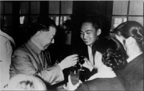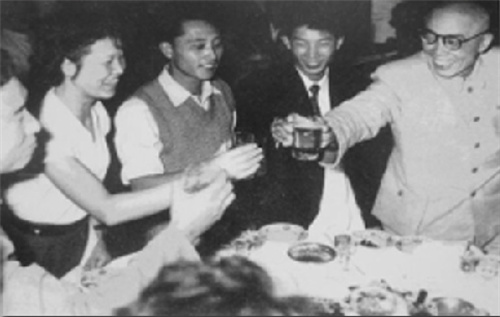 田汉同志在宴会上与《枫洛池》演职人员碰杯庆祝演出成功