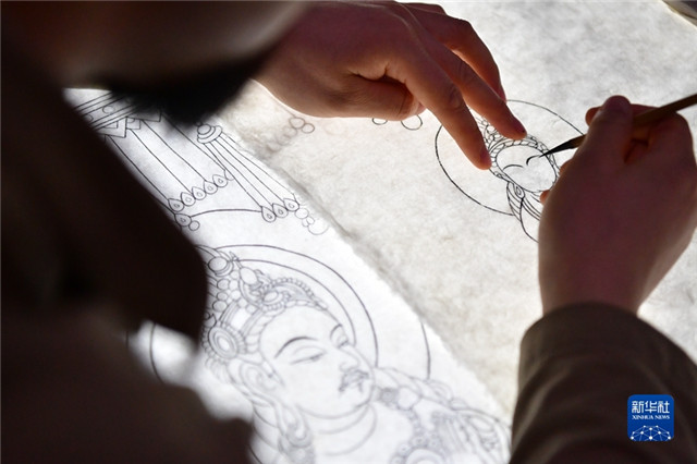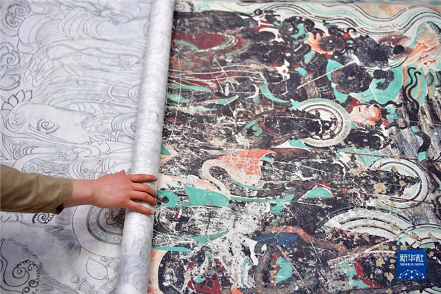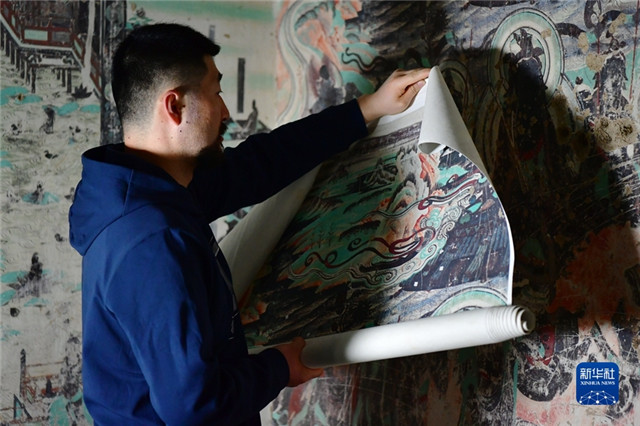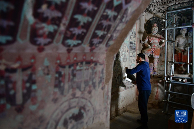 4月19日,在莫高窟第172窟,刘小同在对比临摹壁画的细节。新华社记者 杜哲宇 摄