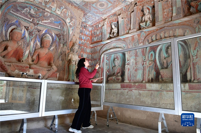4月19日,王娇在莫高窟第259窟做洞窟记录。新华社记者 陈斌 摄