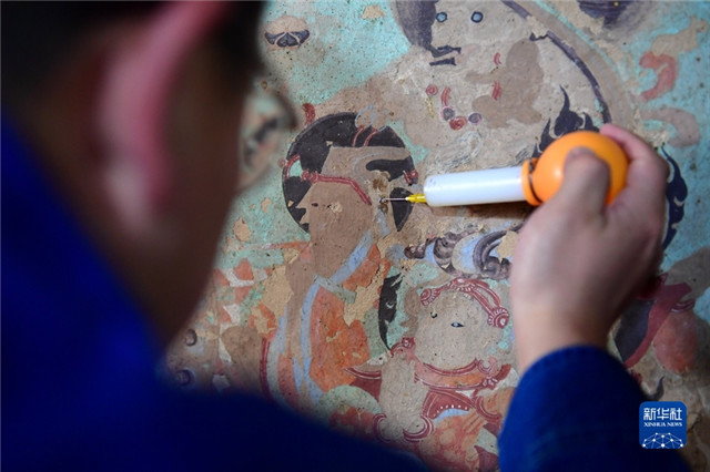 4月19日,在莫高窟第231窟,杨金礼在修复出现病害的壁画。新华社记者 杜哲宇 摄