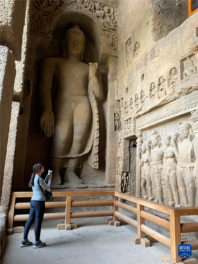 2019年11月,王娇在印度一石窟记录图像资料。新华社发(受访者供图)