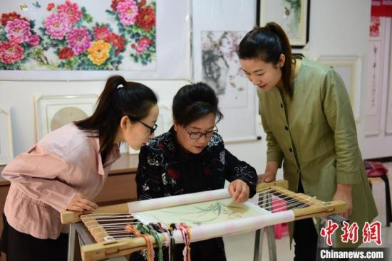 甘肃革命老区庆阳市镇原县“蒋家刺绣”第四代传人蒋存琴(中),教授年轻女性学习刺绣。(资料图)镇原县委宣传部 摄