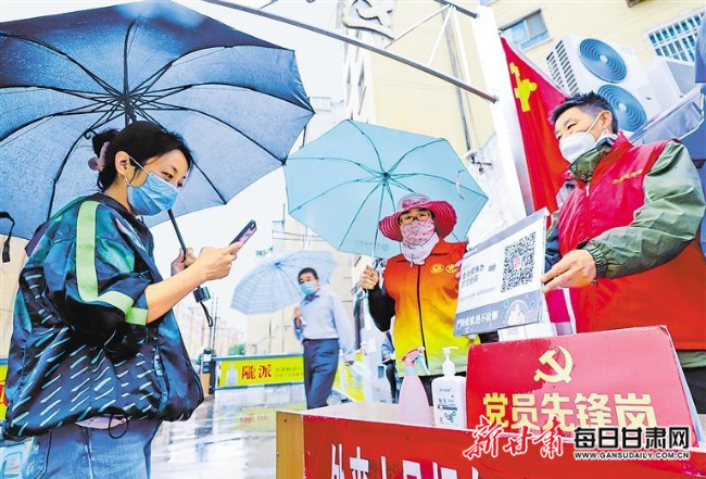 张掖疫情防控一线的党员干部和志愿者在风雨中坚守岗位。