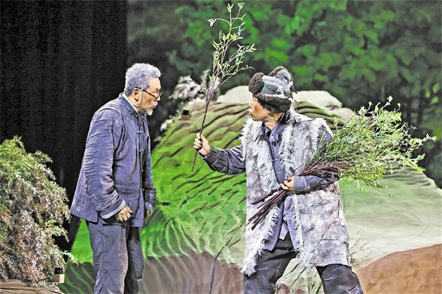 戏剧是高层次的舞台艺术,而话剧更是戏剧语言艺术的王冠,语言是话剧的灵魂。话剧的创作手法不同于戏曲创作中重冲突、重技巧的创作方法。话剧主要通过语言的力度、情感推动剧情的发展和人物精神的塑造。《八步沙》第一场中陆沙娃的妻子因为饥荒去爬火车讨饭的情节,是编剧从林场一个做饭的老人口中淘出来的真实故事。没有这一真实的历史存在,我们很难想象八步沙人如何从求生到求存、从求存到求变这一生态观念的转变。孩子一句“你一个七尺的大男人家,养不起老婆娃娃,自己蹲在屋里让老婆出去要饭吃,你,你不羞吗?”更让我们认识到沙进人退,不能再退的紧迫感。正是这一细节的铺垫,当陆沙娃拿着林场分红的6000元钱,志得意满地交给妻子,真正在老婆孩子面前做了一回男人的戏才有了强烈的共鸣和刻骨铭心的触动。然而这一切的转变折射出来的是改革开放的变化,是甘肃发展的变化。正如陆沙娃所说:“这几年,幸亏有了好政策。我们几个尕老汉聚在一起种树治沙护林,干多少拿多少,干得多拿得多,一年下来能拿回这么多钱,我苦啥?我每天巡林子都唱歌着呢。我陆沙娃老了老了才真正做了一回养家的男人!”养家的男人,这句过去存在、今天依然有生命力的普通话语体现的是时代变迁和人民生活翻天覆地的变化。