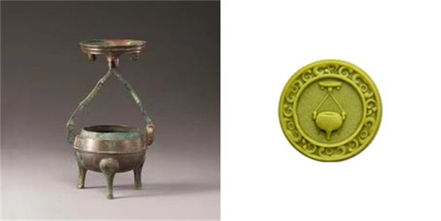 拼版图片:左图为鼎形铜行灯文物图片;右图为甘肃省博物馆根据鼎形铜行灯创作的青梅龙井雪媚娘月饼。鼎形铜行灯出土于甘肃省平凉市庙庄战国秦墓,收合时为附耳三足盖鼎,内盛燃灯时所用的油料,用灯时将双键支起,可插入鼎盖中心的圆銎中,鼎盖即成为灯盏。该鼎形灯构造精巧,设计科学,使用方便,封口严密不溢油,为贵族出行时使用的灯。(甘肃省博物馆供图)