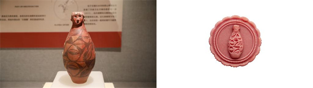 拼版图片:左图为6月11日在甘肃省博物馆拍摄的人头形器口彩陶瓶复制品(新华社记者何问摄);右图为甘肃省博物馆根据人头形器口彩陶瓶创作的奶酪红酒蔓越莓月饼(甘肃省博物馆供图)。人头形器口彩陶瓶出土于甘肃省天水市秦安县大地湾遗址,属仰韶文化庙底沟类型,距今约5500年,器口为圆雕头像,五官端正,瓶身施黑彩,每层图案分为两部分。