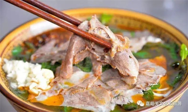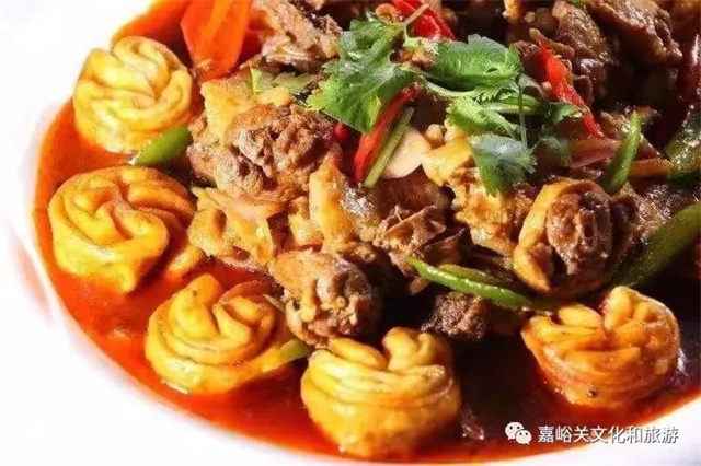 羊肉粉汤,羊肉粉汤是嘉峪关这座小城地道的传统小吃,羊肉粉汤的味道清香,令人垂涎欲滴。羊肉不仅能补虚益血,开胃健脾,还能去湿气,避寒冷,暖胃寒。羊肉经处理熟而不烂,带着点韧劲,汤汁鲜醇,而且香辣爽口,食之肥而不腻。